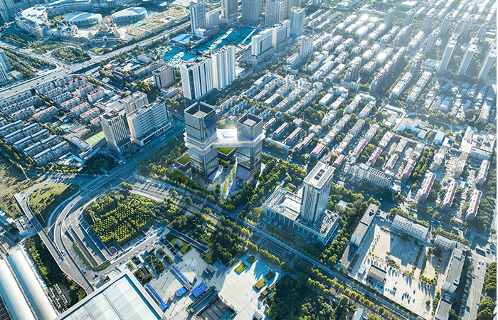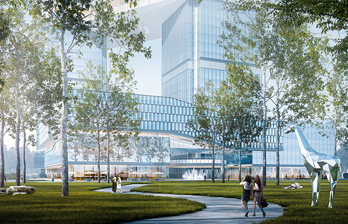 南側(cè)企業(yè)總部以L型高低錯(cuò)落布局呼應(yīng)塔樓形態(tài),創(chuàng)建公園式辦公組群,有機(jī)銜接場(chǎng)地周邊綠地景觀,營(yíng)造活力多樣化的景觀空間。中華大街沿線結(jié)合周邊組團(tuán),形成層次豐富、舒緩延展的優(yōu)美天際線。