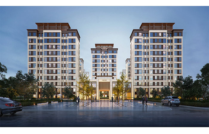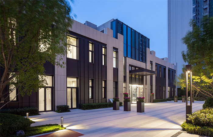 建筑立面整體風格以“典雅”的現(xiàn)代主義氣質(zhì)為主,為了保證鮮明的層次感,采用了米黃色石材、真石漆和淺灰色金屬、金屬漆四種材質(zhì),通過選材和構(gòu)造設(shè)計,在極簡的基調(diào)中塑造動人的完整性。整體以框架結(jié)合簡潔的橫向線條的形式構(gòu)成,整體效果簡潔典雅。