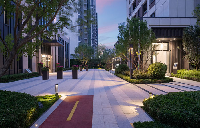 地塊形成南北向和東西向兩條景觀軸,南北主軸為本項目景觀設(shè)計重點部位,力爭打造“園中有筑,筑即為景”的建筑與景觀結(jié)合的典范中軸系統(tǒng)。地塊形成四個分區(qū)。序列性景觀節(jié)點,形成多重禮儀空間,傳承中國的空間禮序。通過中軸建筑的錯落式布局,形成多個半圍合式的居住組團空間。
