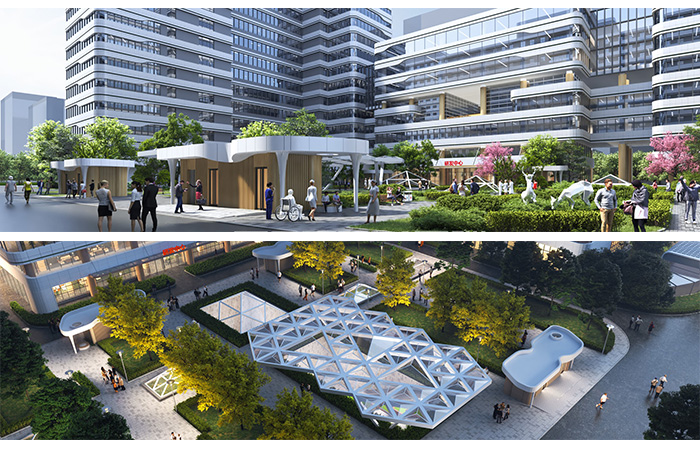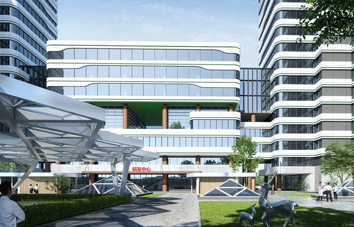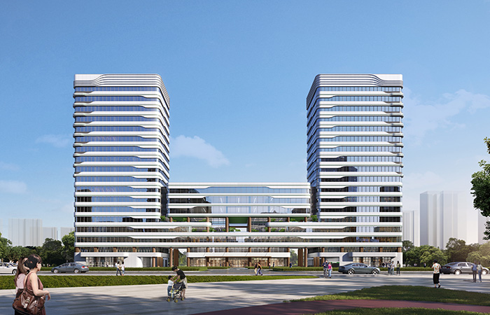 方案從平安醫(yī)院的LOGO展翅的鴿子形象中提取雙翅元素,沿建通街西立面植入兩條雙翅曲線,象征著愛與希望。南立面純凈的白色水平線條相互穿插、底層設(shè)置架空,科研樓中部設(shè)置南北通透的空中花園,同時(shí)引入垂直綠化,使整個(gè)建筑給人以平靜祥和的心理感受。