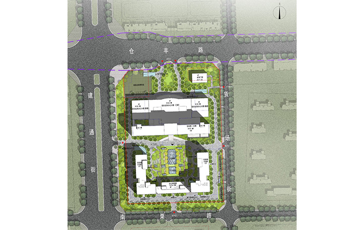 規(guī)劃設(shè)計(jì)在現(xiàn)狀建筑南側(cè)植入U(xiǎn)型新建建筑體量,新建建筑與原有建筑形成“一軸一院一廣場(chǎng)”中軸對(duì)稱的總體布局。削減南側(cè)建筑體量,減弱南側(cè)百米高層對(duì)建筑的不利影響,在體塊交界處凹入,將底層架空、置入空中花園,使中心院落與外部空間得以互相滲透,打造出一座立體花園式的療愈醫(yī)院。