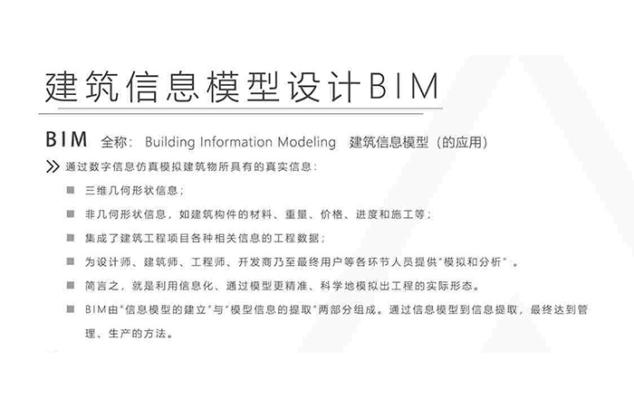 BIM由“信息模型的建立”與“模型信息的提取”兩部分組成。通過信息模型到信息提取,最終達(dá)到管理、生產(chǎn)的方法。