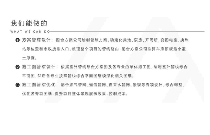 方案管綜設(shè)計(jì):配合方案公司繪制管綜方案,確定化糞池、泵房、開閉所、變配電室、換熱站等位置和市政接排入口,梳理整個(gè)項(xiàng)目的管線路由,配合方案公司推算車庫(kù)頂板最小覆土厚度。