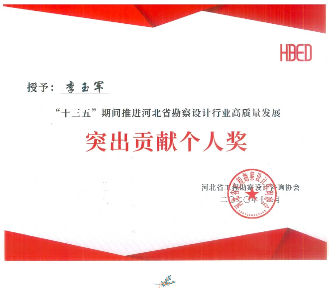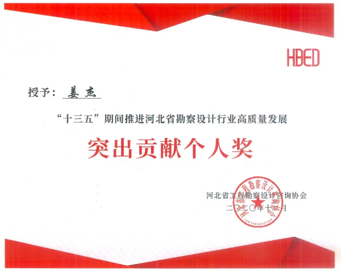 河北省勘察設(shè)計(jì)行業(yè)高質(zhì)量發(fā)展“突出貢獻(xiàn)個(gè)人”榮譽(yù)稱號(hào)。