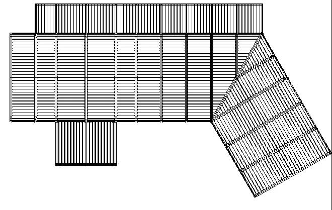 整個(gè)結(jié)構(gòu)形式:豎向承重構(gòu)件為實(shí)木柱,水平傳力構(gòu)件為實(shí)木梁,屋面板為擱柵加木基板。水平向的實(shí)木梁將單榀木桁架連在一起,外側(cè)實(shí)木柱加柱間斜撐,屋蓋為擱柵加木基板,確保了抗側(cè)剛度和平面外穩(wěn)定性。