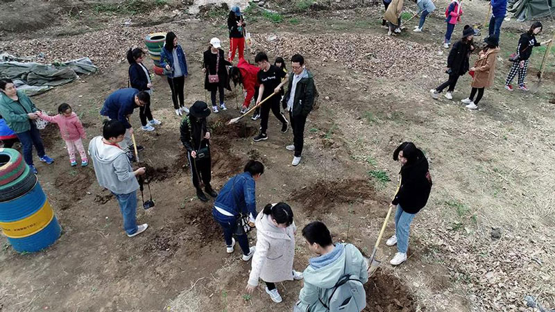 大家扛起鐵鍬,領(lǐng)取樹苗,帶領(lǐng)著孩子們奔赴植樹地點(diǎn)。