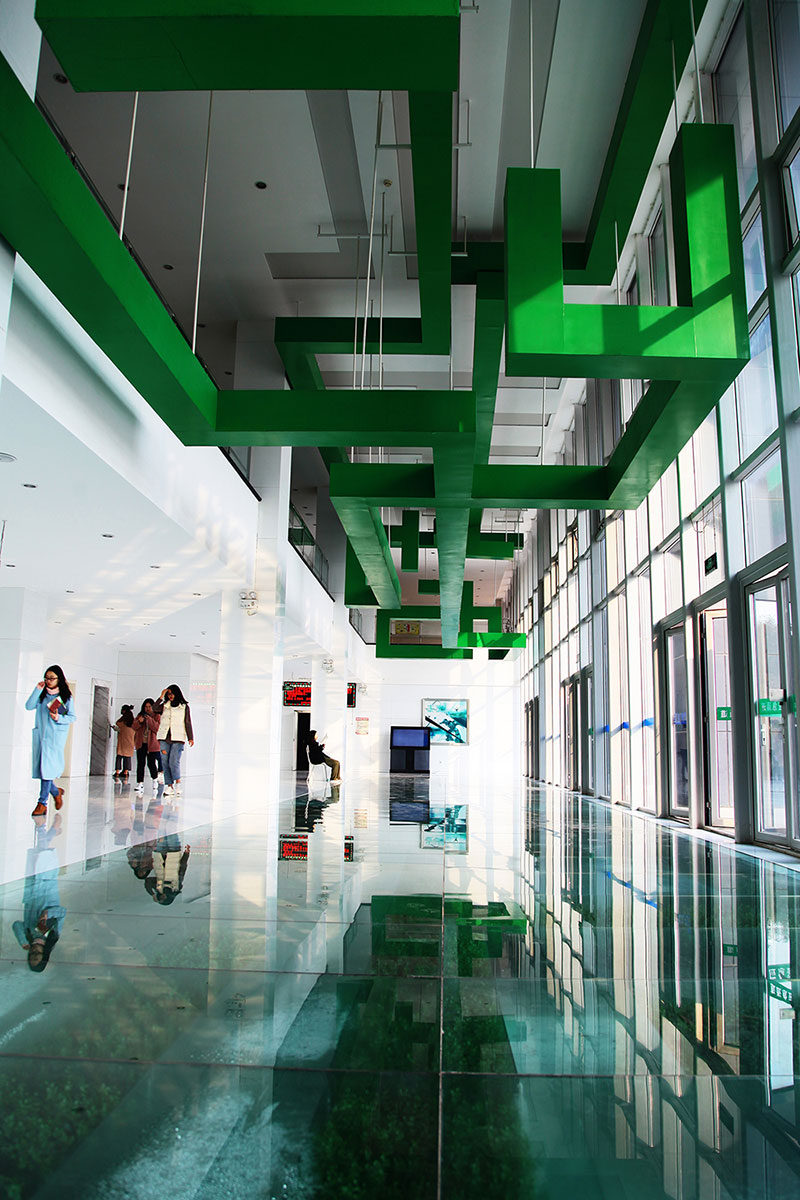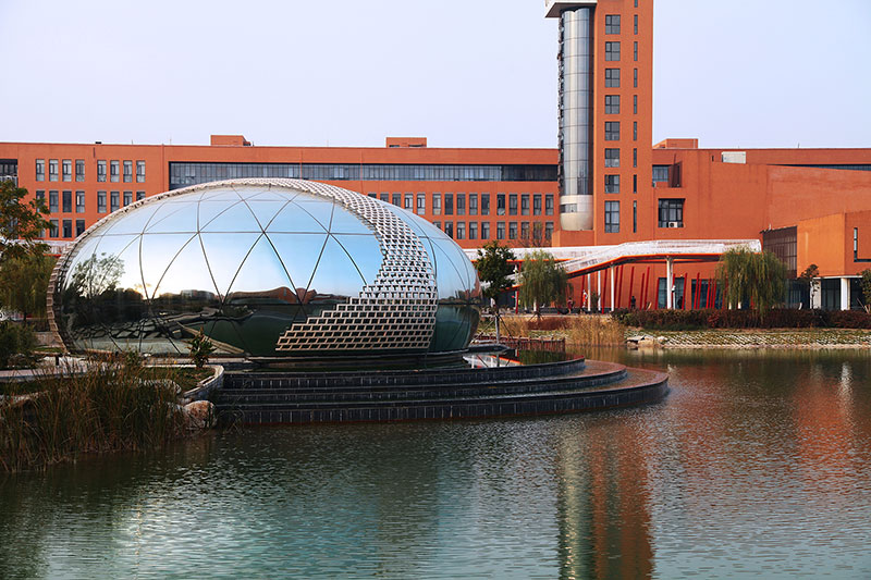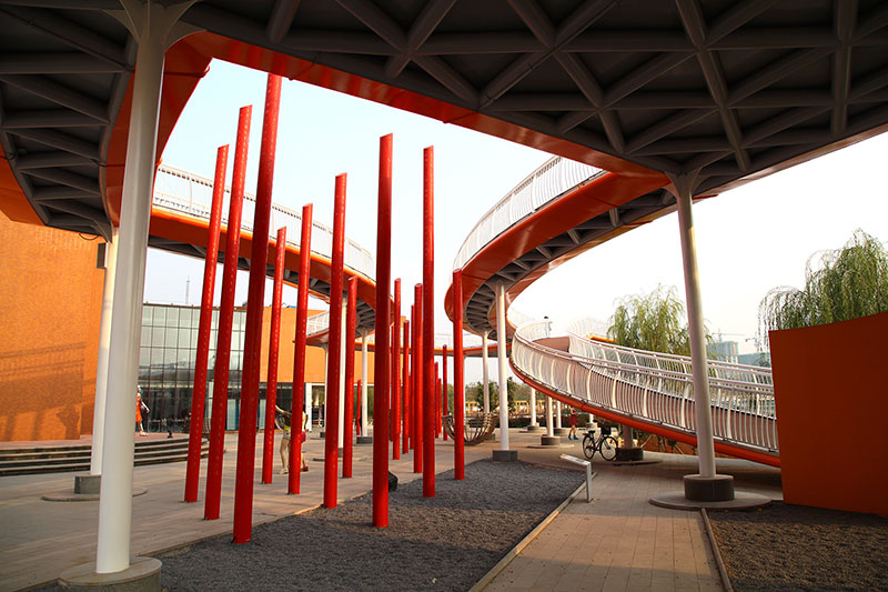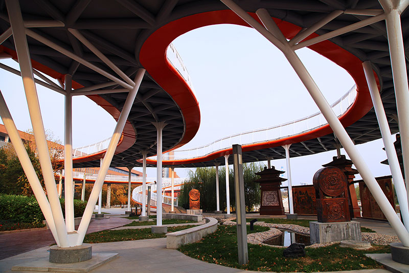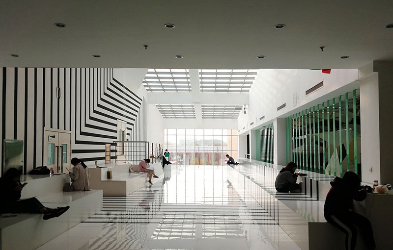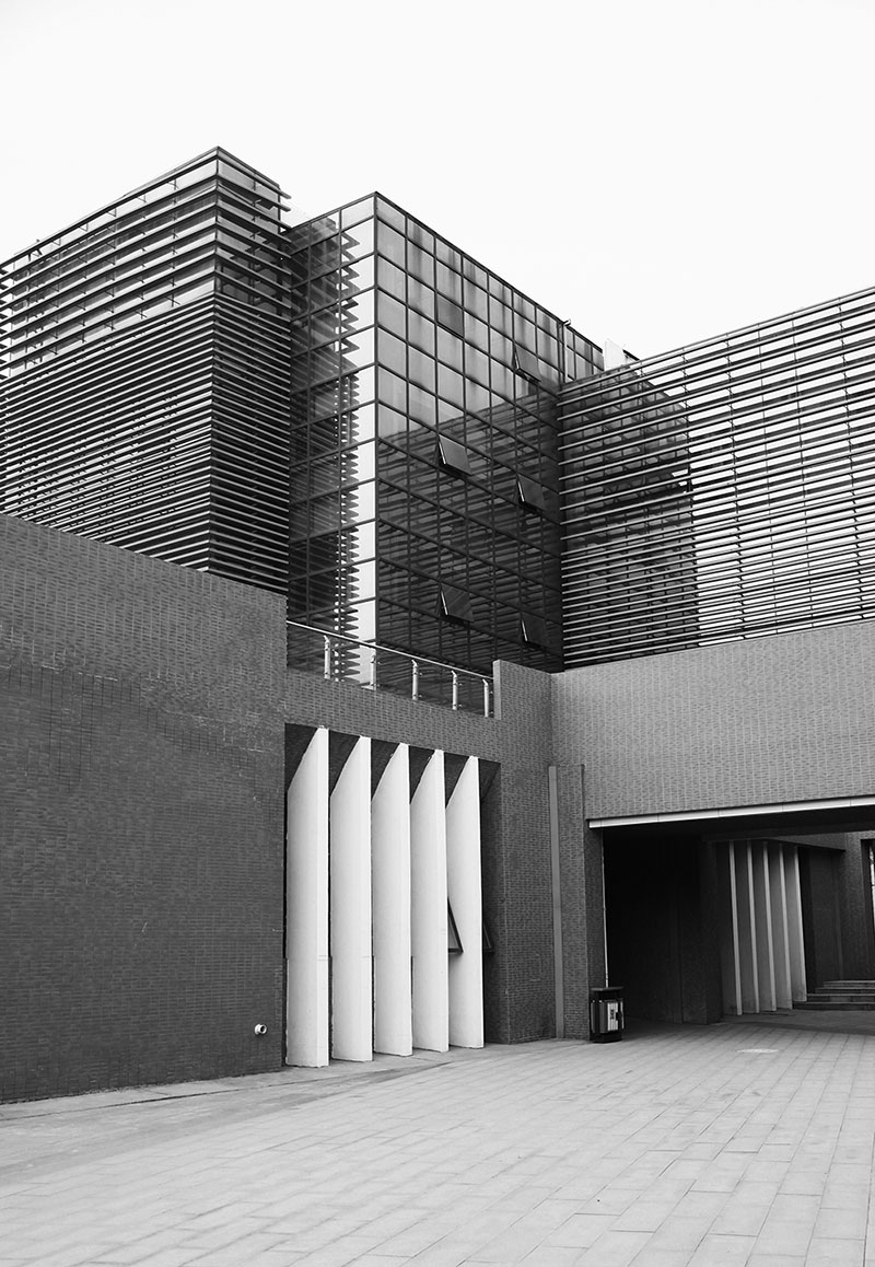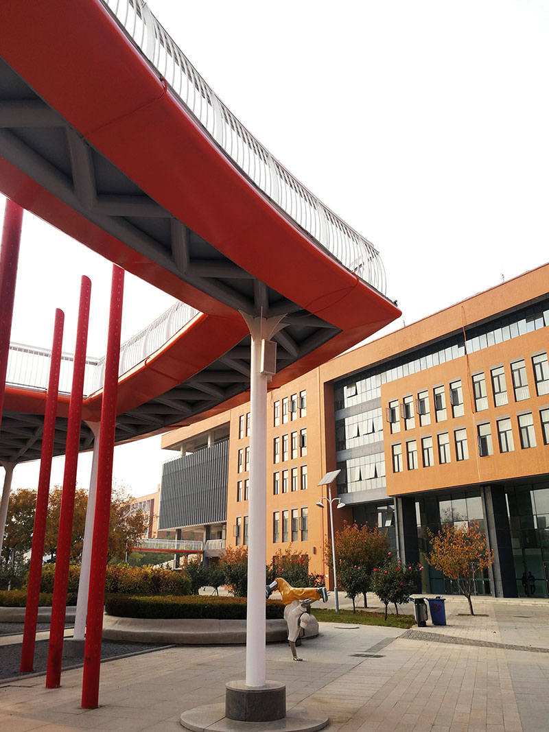 從整體規(guī)劃布局上看,校園內(nèi)各樓排布張弛有度,建筑與景觀相互結(jié)合,中央大湖與景觀廊架搭配蜿蜒蜷曲的步道,平靜中孕育詩意,給一所沉穩(wěn)的文化建筑帶來靈動的韻律之美。