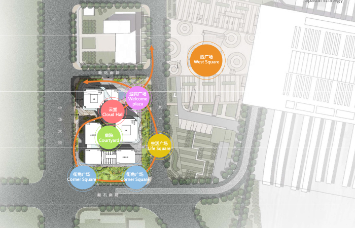 南側(cè)企業(yè)總部以L型高低錯(cuò)落布局呼應(yīng)塔樓形態(tài),創(chuàng)建公園式辦公組群,有機(jī)銜接場(chǎng)地周邊綠地景觀,營(yíng)造活力多樣化的景觀空間。中華大街沿線結(jié)合周邊組團(tuán),形成層次豐富、舒緩延展的優(yōu)美天際線。