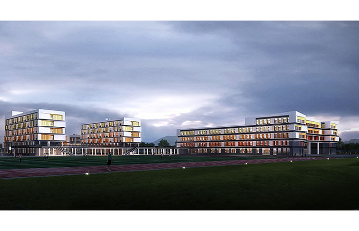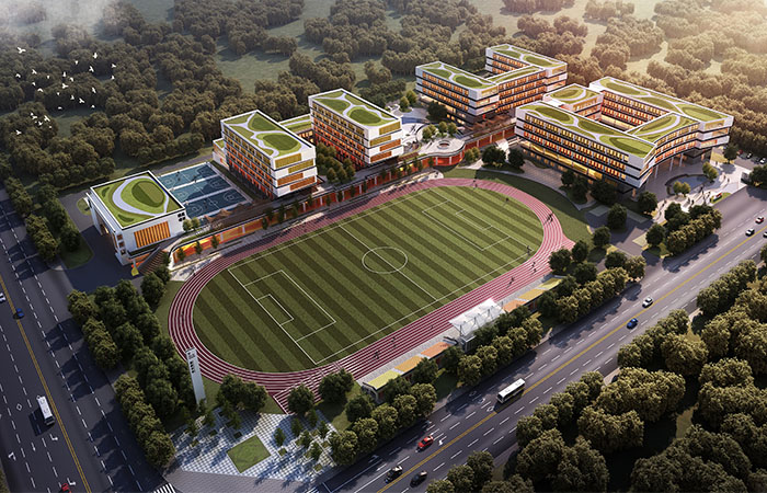 學(xué)校外立面隱喻書海,像許多本書堆疊在一起,形成書海綠洲;校園東側(cè)擁有大片綠海,便于學(xué)生親近自然,擁抱綠色,形成學(xué)習(xí)森林。中部風(fēng)雨連廊首層架空,結(jié)合中部觀景平臺(tái)提供給學(xué)生更多的共享灰空間;北側(cè)風(fēng)雨操場(chǎng)、學(xué)生宿舍與南側(cè)教學(xué)樓、綜合樓通過連廊成為一個(gè)建筑整體,結(jié)合西側(cè)操場(chǎng)和東側(cè)生態(tài)園形成立體樂園。最終創(chuàng)造一所混合性、體驗(yàn)性、人文性和生態(tài)性多功能細(xì)化互融的新型學(xué)校。