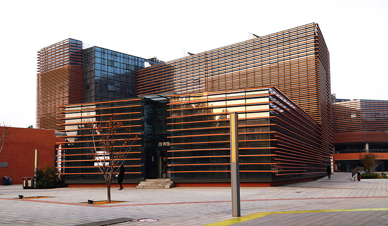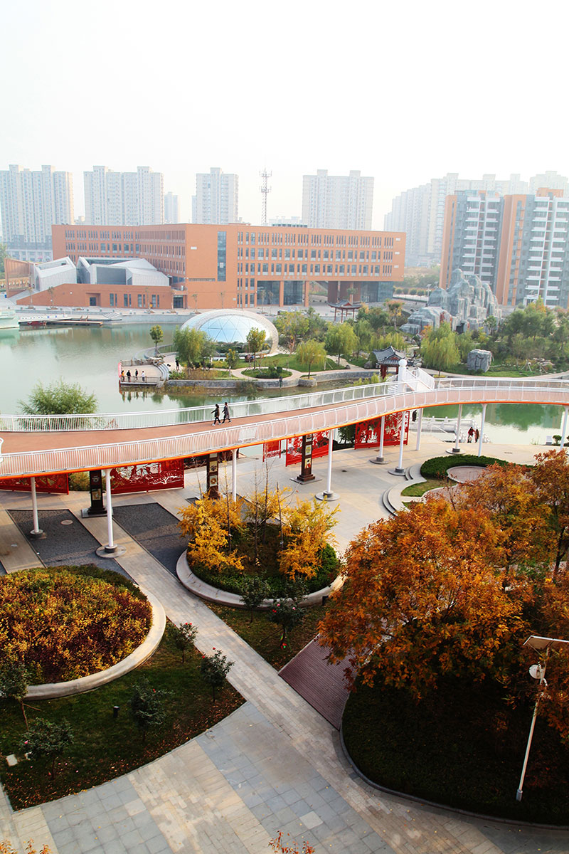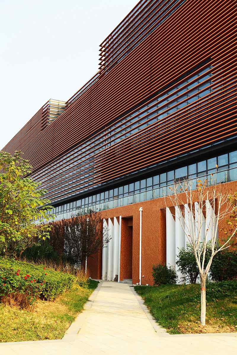 從整體規(guī)劃布局上看,校園內(nèi)各樓排布張弛有度,建筑與景觀相互結(jié)合,中央大湖與景觀廊架搭配蜿蜒蜷曲的步道,平靜中孕育詩意,給一所沉穩(wěn)的文化建筑帶來靈動的韻律之美。